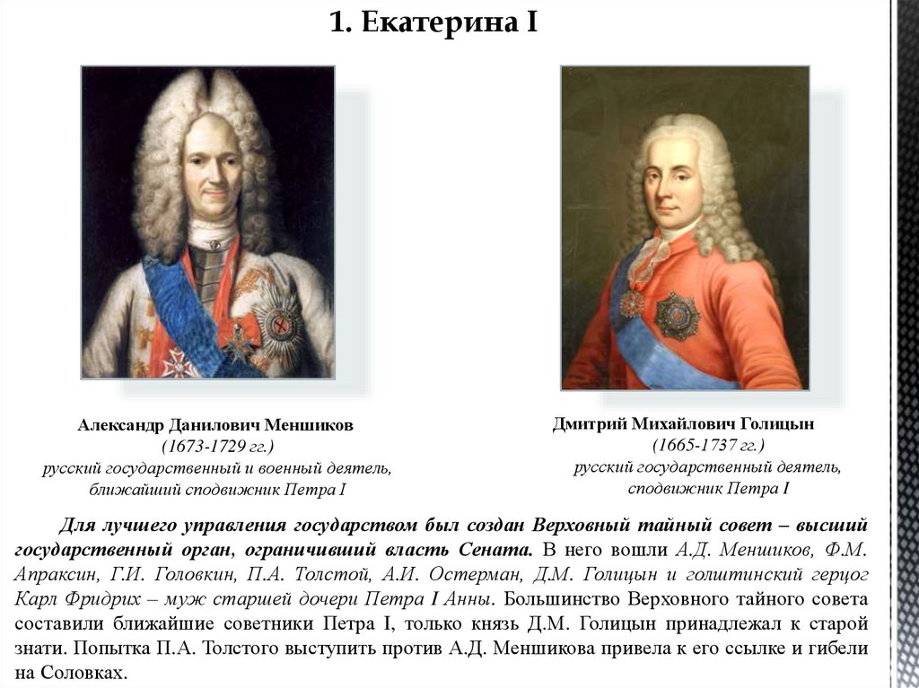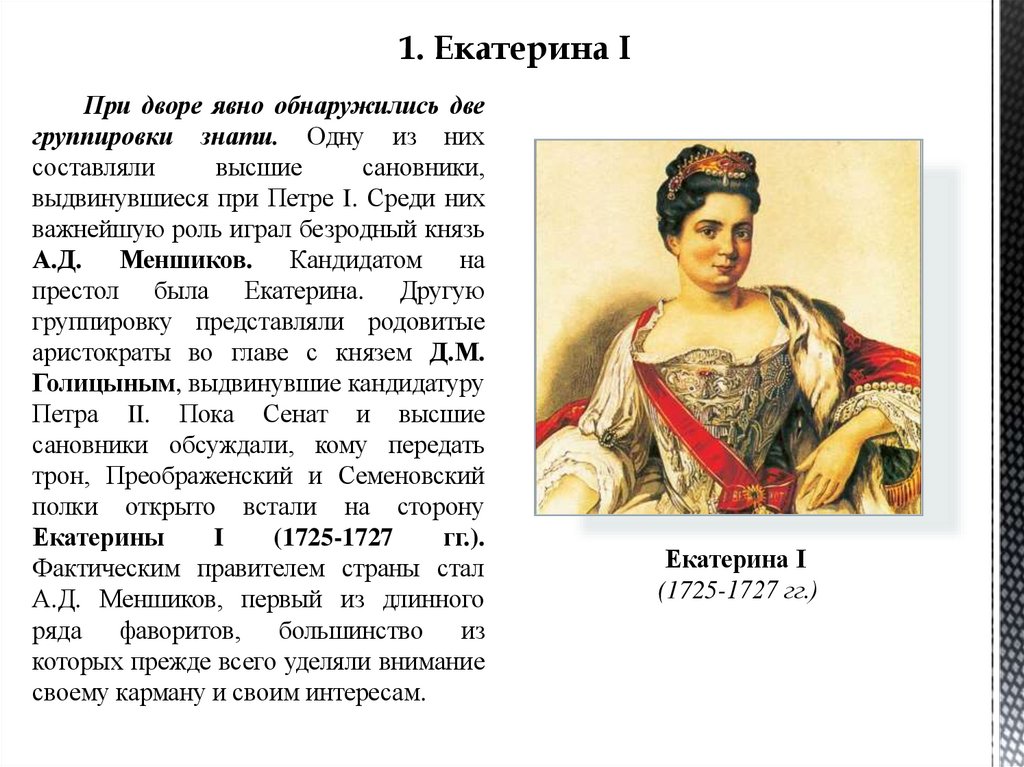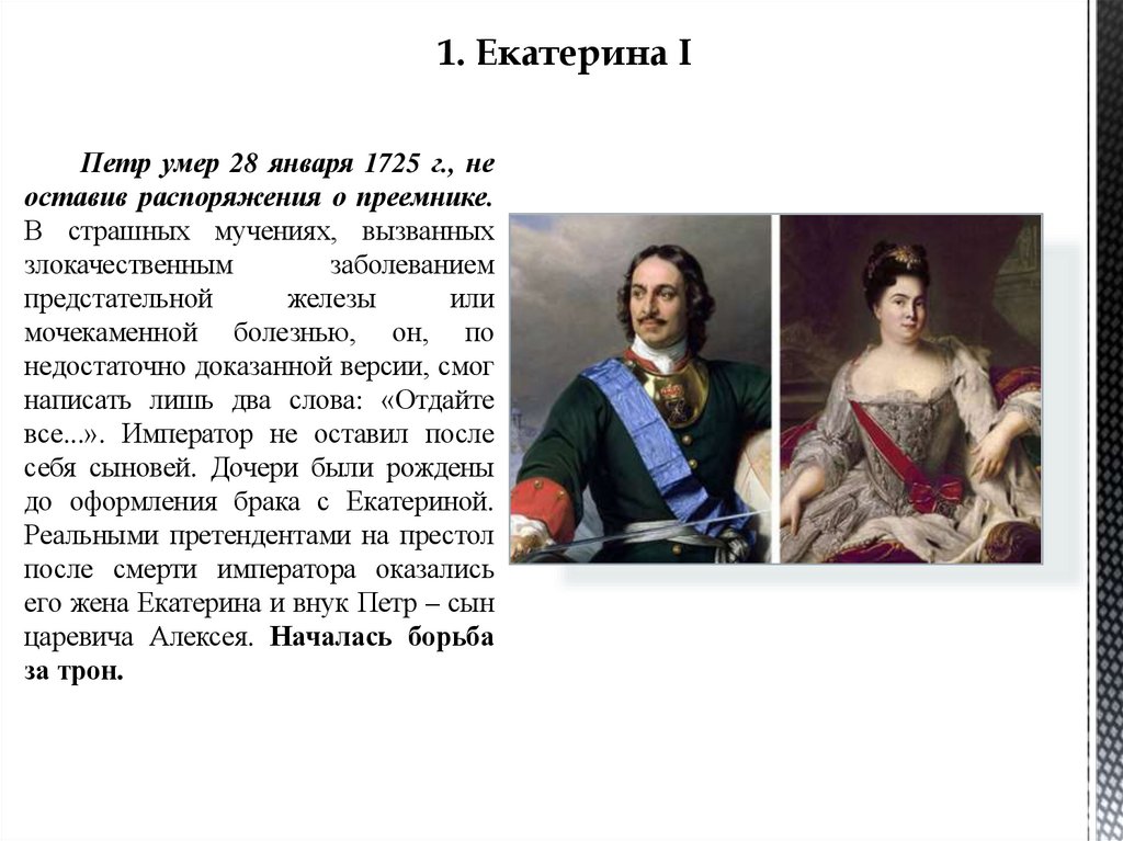 1. Екатерина IПетр умер 28 января 1725 г., не