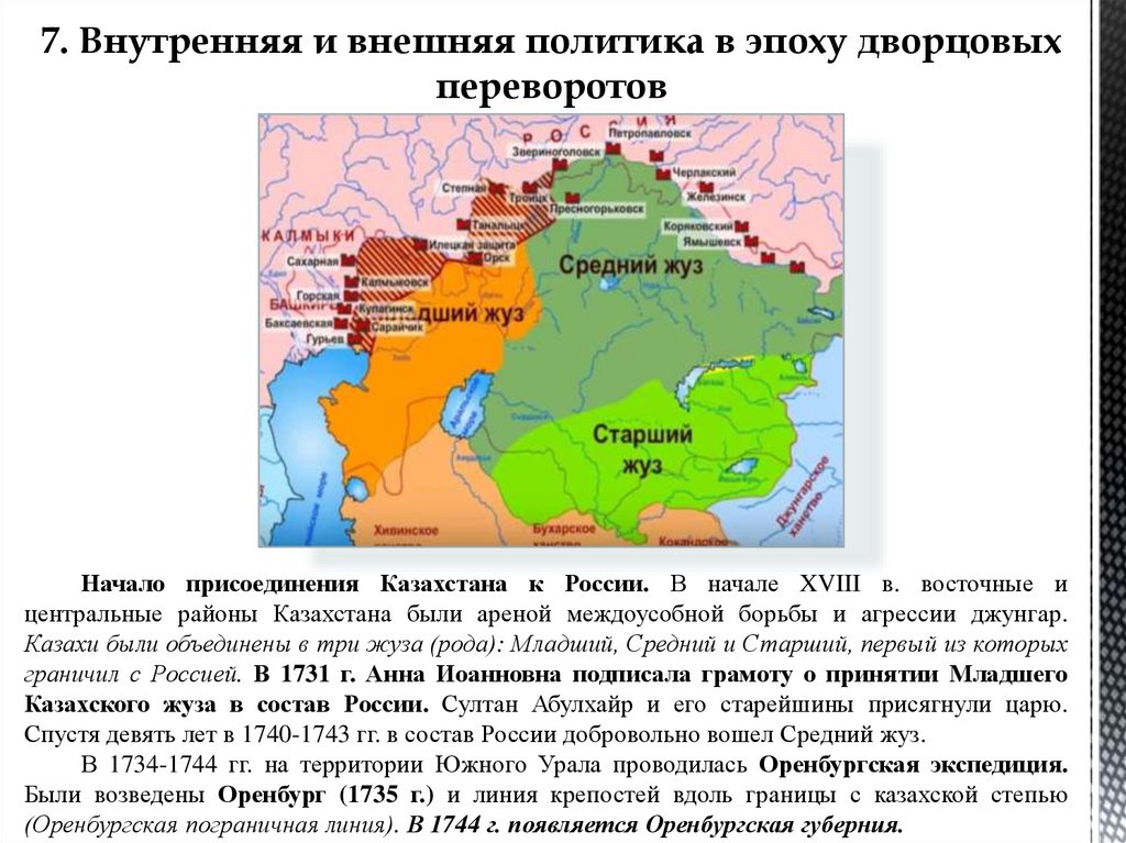 Были возведены Оренбург (1735 г.) и линия крепостей вдоль границы с казахской степью