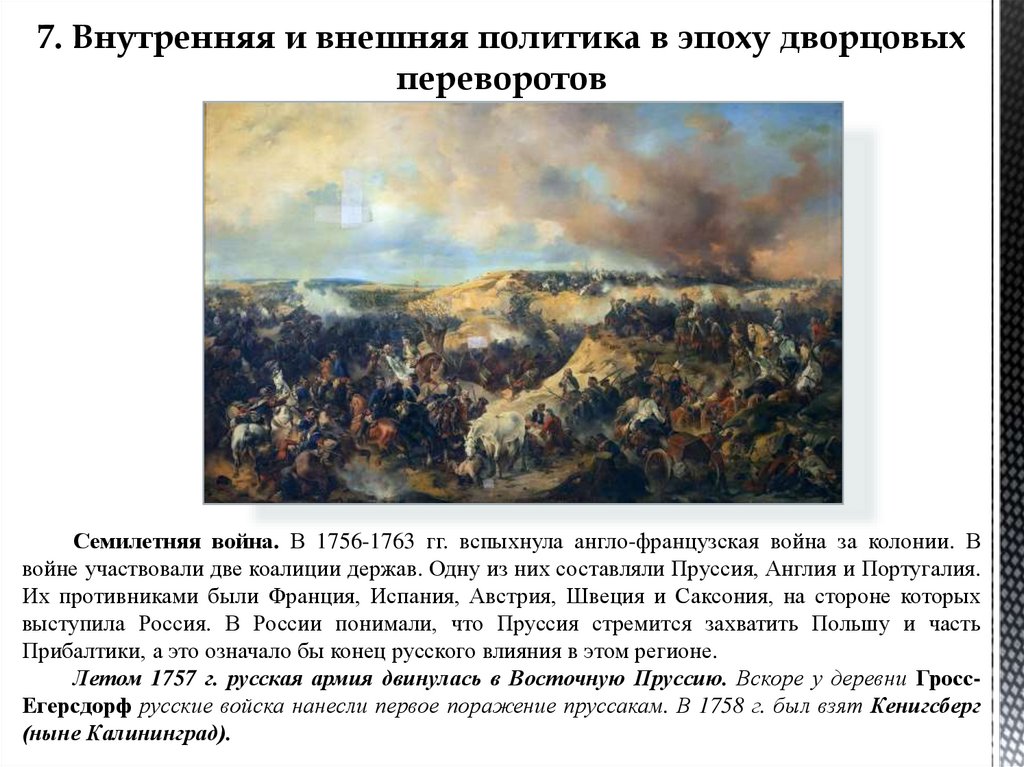 Летом 1757 г. русская армия двинулась в Восточную Пруссию. Вскоре у деревни ГроссЕгерсдорф русские войска нанесли первое поражение пруссакам. В 1758 г. был взят Кенигсберг