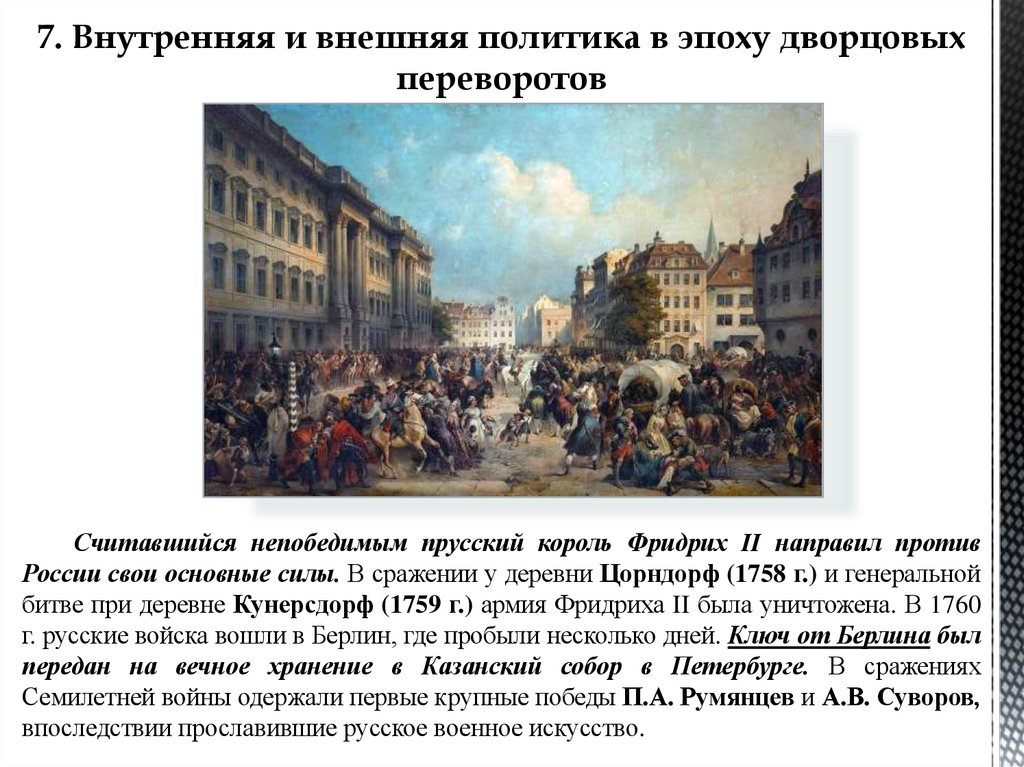 Семилетней войны одержали первые крупные победы П.А. Румянцев и А.В. Суворов,