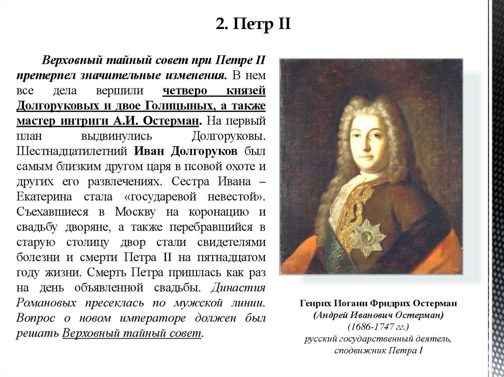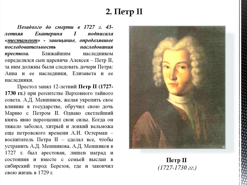 Престол занял 12-летний Петр II (17271730 гг.) при регентстве Верховного тайного