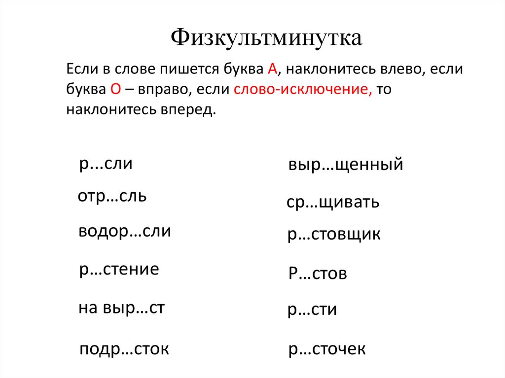 ФизкультминуткаЕсли в слове пишется буква А, наклонитесь влево, если