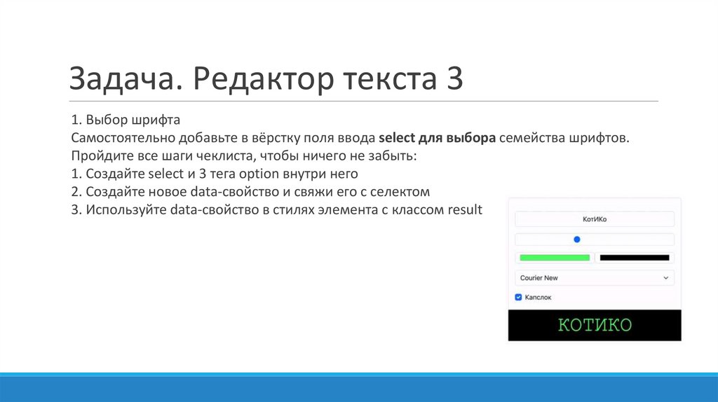 Самостоятельно добавьте в вёрстку поля ввода select для выбора семейства шрифтов.