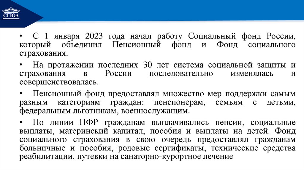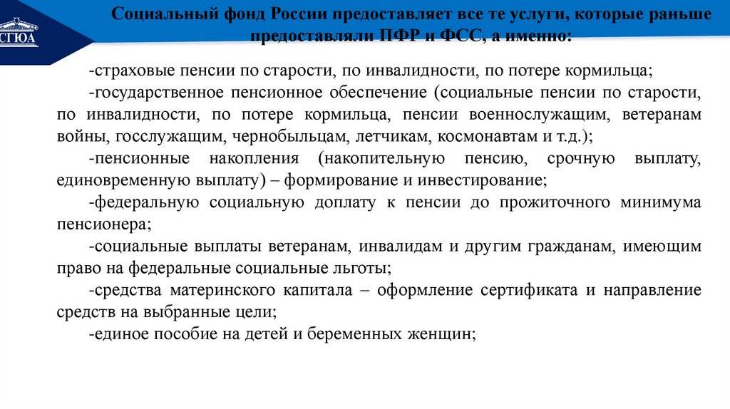 Социальный фонд России предоставляет все те услуги, которые раньшепредоставляли ПФР и ФСС, а именно: