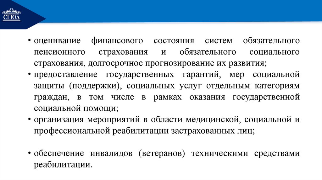 • оценивание финансового состояния систем обязательногопенсионного страхования и обязательного социального