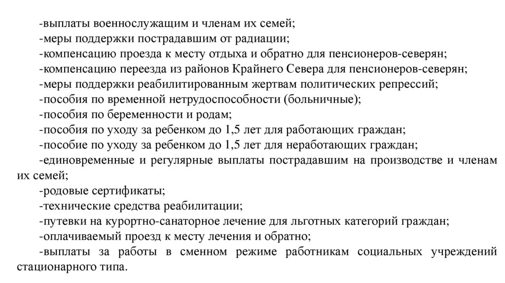 -выплаты военнослужащим и членам их семей;-меры поддержки пострадавшим от радиации;