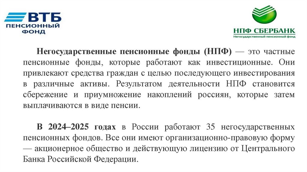 Негосударственные пенсионные фонды (НПФ) — это частныепенсионные фонды, которые работают как инвестиционные. Они
