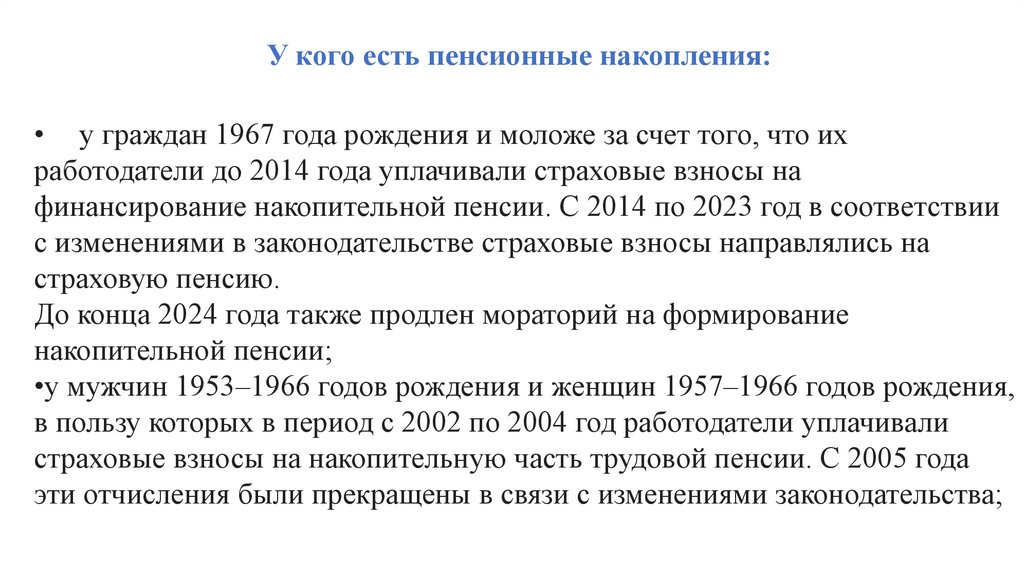У кого есть пенсионные накопления:• у граждан 1967 года рождения и моложе за счет того, что их