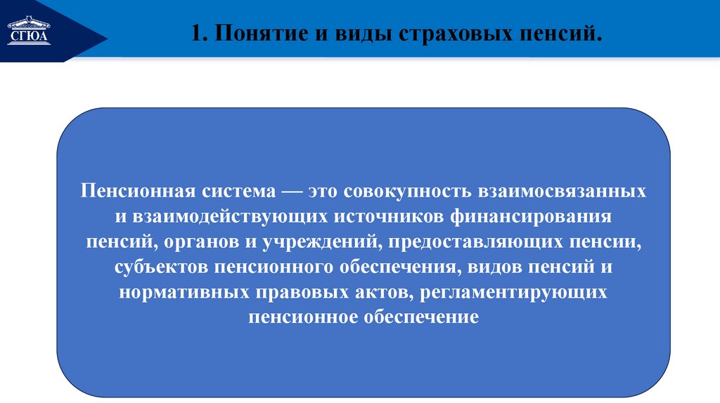 1. Понятие и виды страховых пенсий.Пенсионная система — это совокупность взаимосвязанных