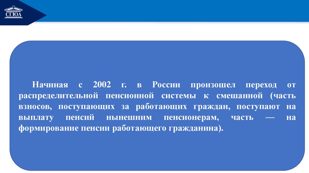 Начиная с 2002 г. в России произошел переход отраспределительной пенсионной системы к смешанной (часть