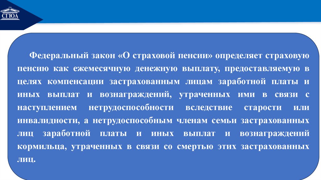 Федеральный закон «О страховой пенсии» определяет страховуюпенсию как ежемесячную денежную выплату, предоставляемую в