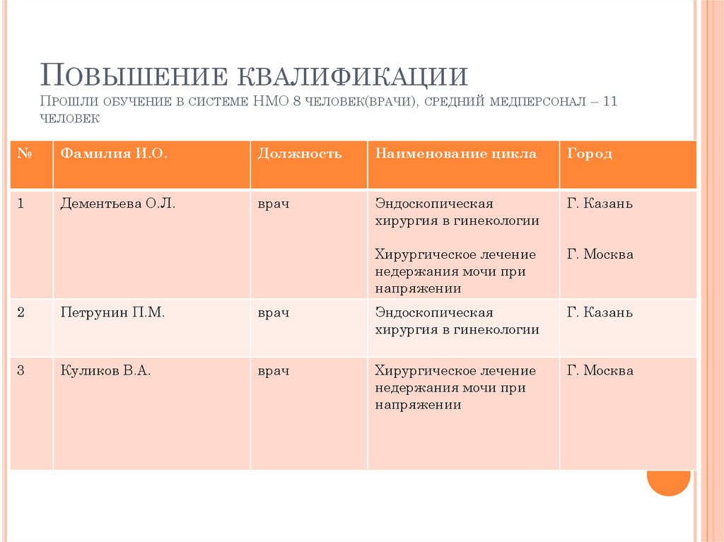 ПОВЫШЕНИЕ КВАЛИФИКАЦИИПРОШЛИ ОБУЧЕНИЕ В СИСТЕМЕ НМО 8 ЧЕЛОВЕК(ВРАЧИ), СРЕДНИЙ МЕДПЕРСОНАЛ – 11