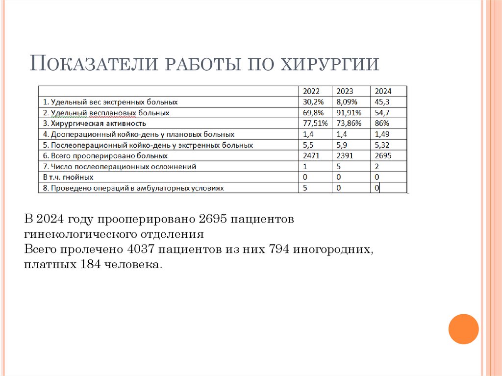 ПОКАЗАТЕЛИ РАБОТЫ ПО ХИРУРГИИВ 2024 году прооперировано 2695 пациентов