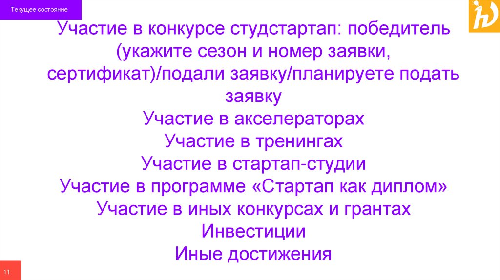 Текущее состояниеУчастие в конкурсе студстартап: победитель