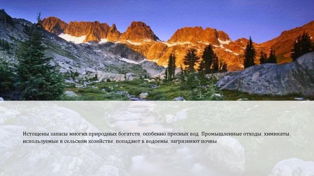 Истощены запасы многих природных богатств, особенно пресных вод. Промышленные отходы, химикаты,используемые в сельском хозяйстве, попадают в водоемы, загрязняют почвы.