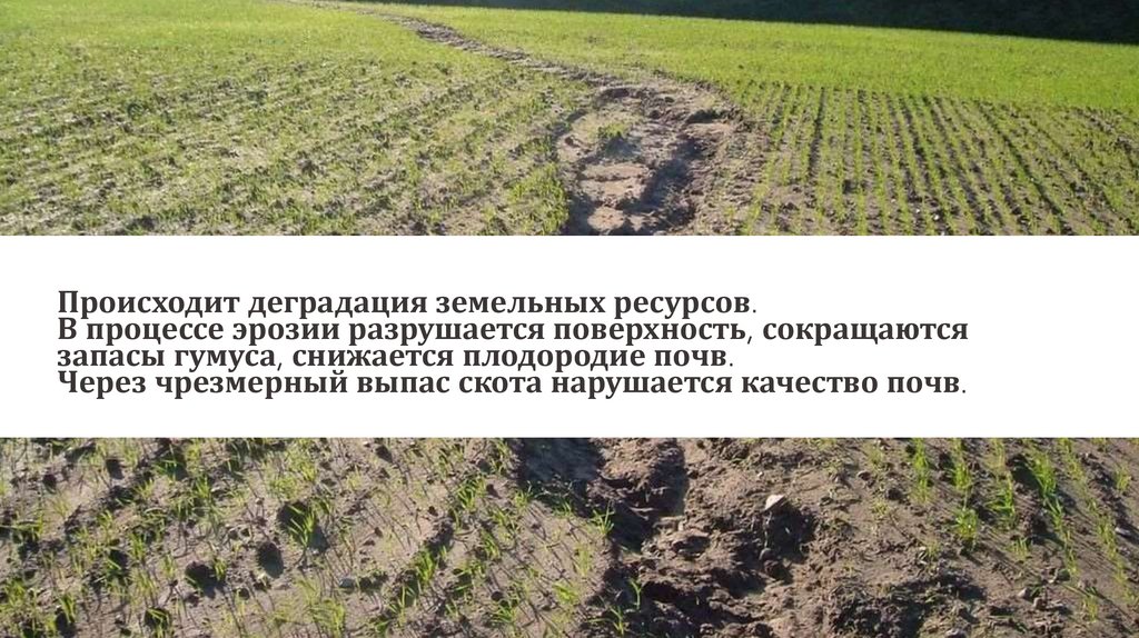 Происходит деградация земельных ресурсов.В процессе эрозии разрушается поверхность, сокращаются