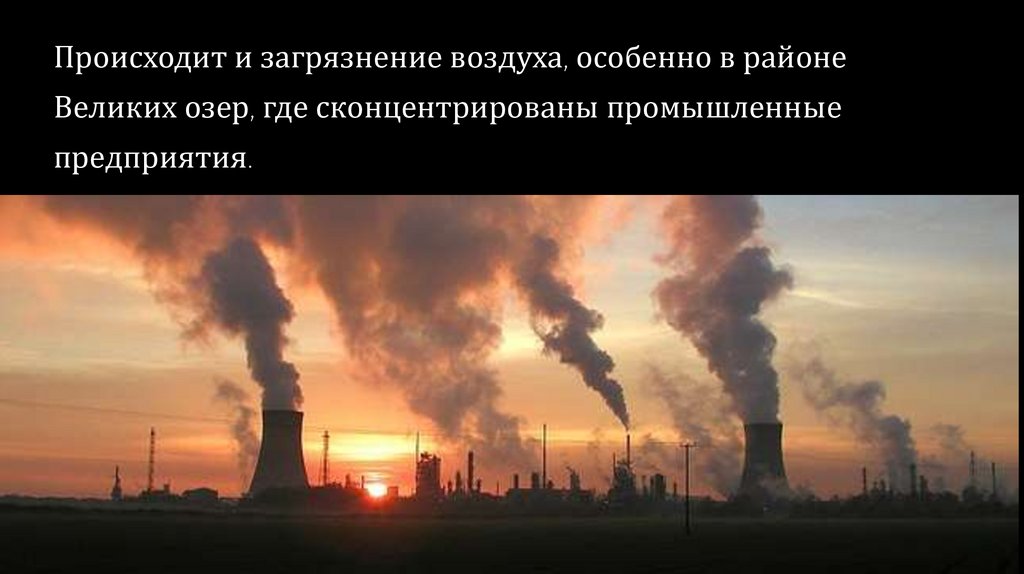 Происходит и загрязнение воздуха, особенно в районеВеликих озер, где сконцентрированы промышленные