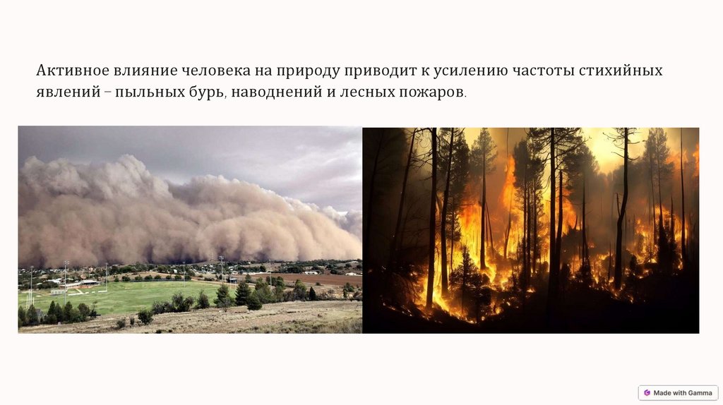 Активное влияние человека на природу приводит к усилению частоты стихийныхявлений – пыльных бурь, наводнений и лесных пожаров.