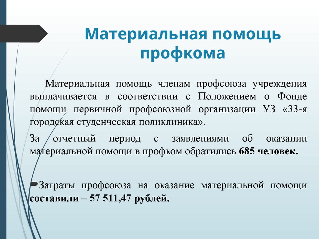 Материальная помощь членам профсоюза учреждениявыплачивается в соответствии с Положением о Фонде