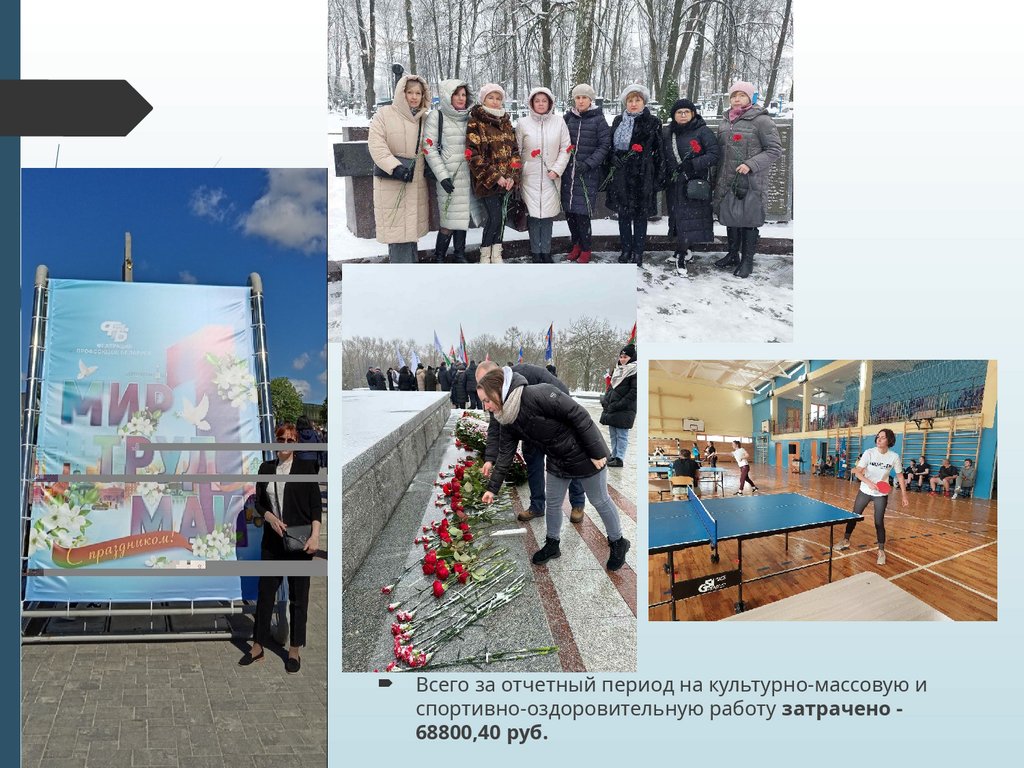 Всего за отчетный период на культурно-массовую испортивно-оздоровительную работу затрачено 68800,40 руб.