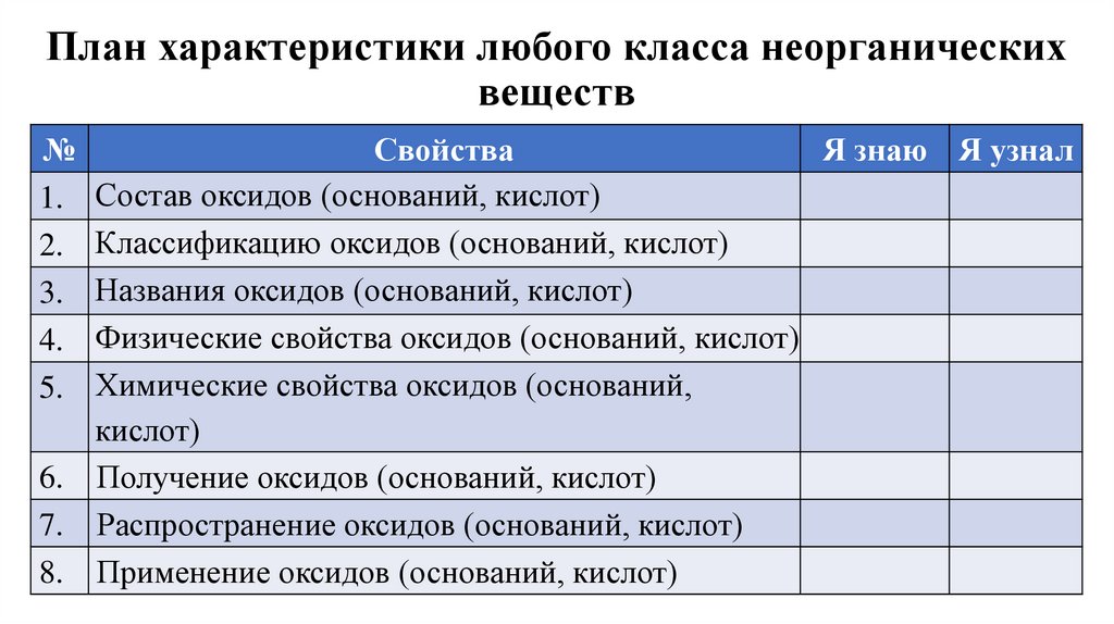 План характеристики любого класса неорганическихвеществ