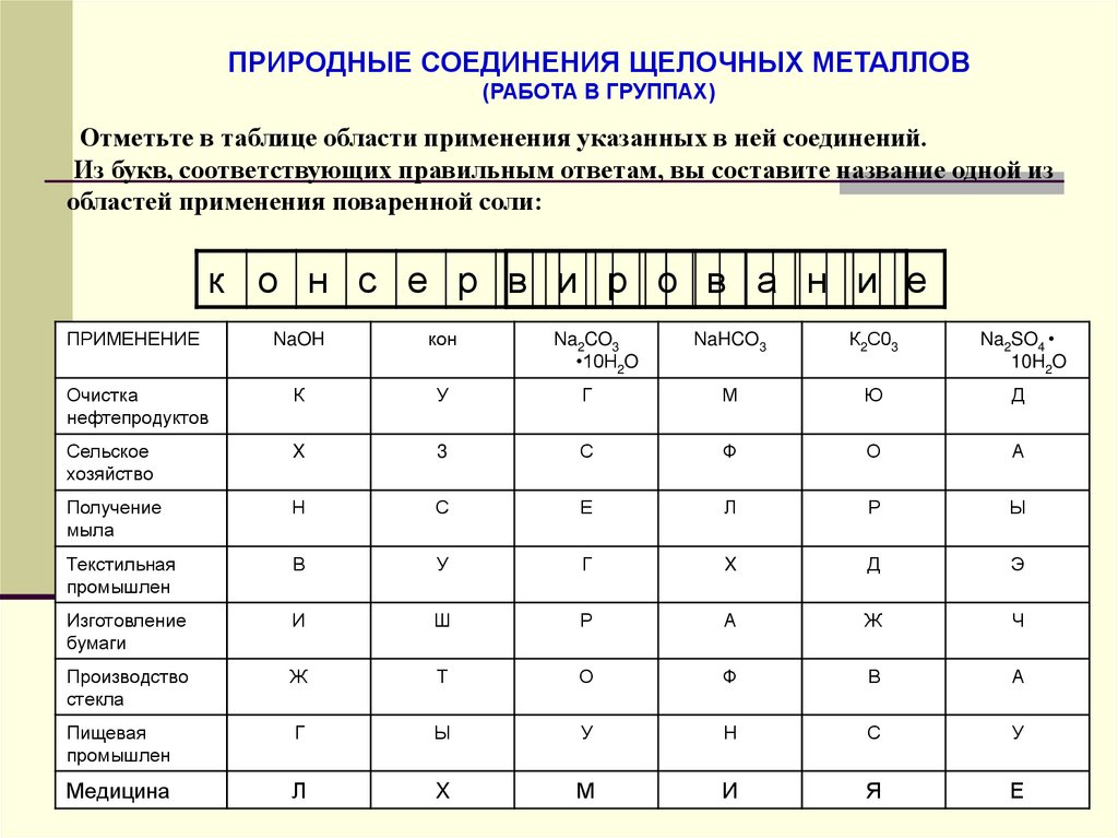 ПРИРОДНЫЕ СОЕДИНЕНИЯ ЩЕЛОЧНЫХ МЕТАЛЛОВ(РАБОТА В ГРУППАХ)