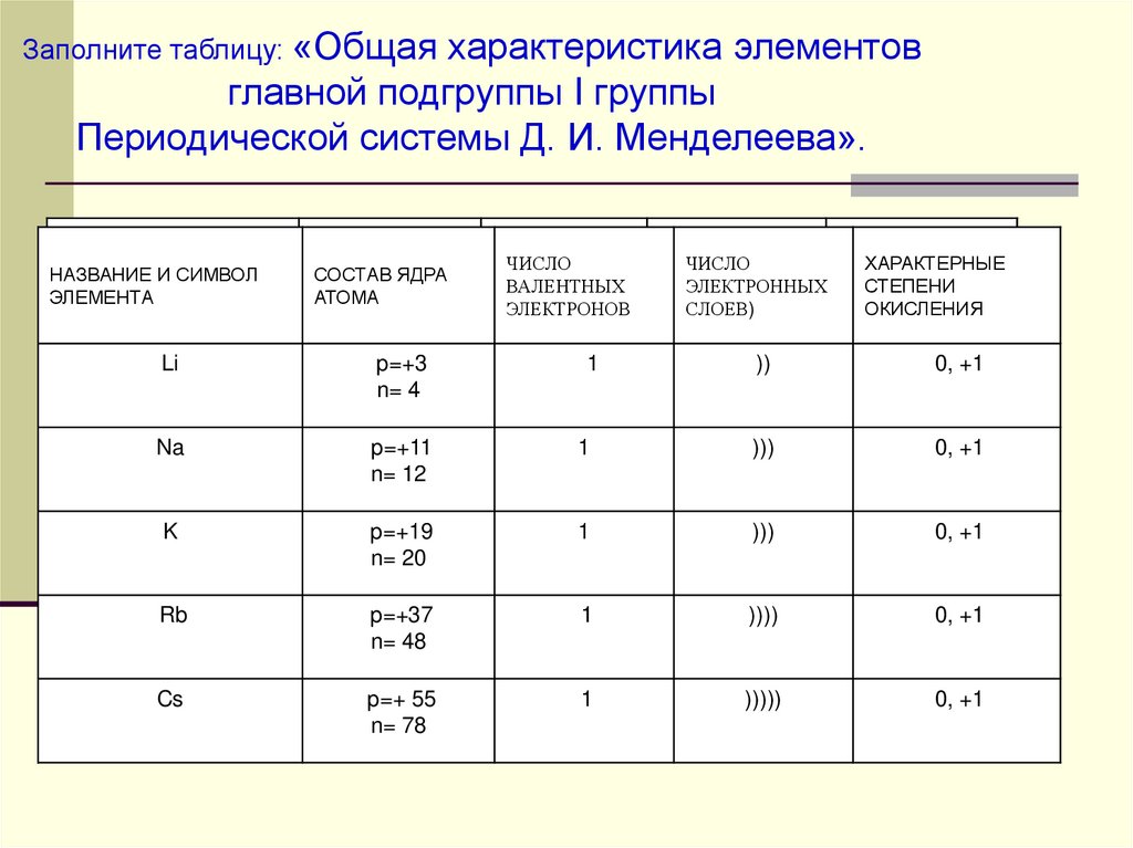 Заполните таблицу: «Общая характеристика элементовглавной подгруппы I группы