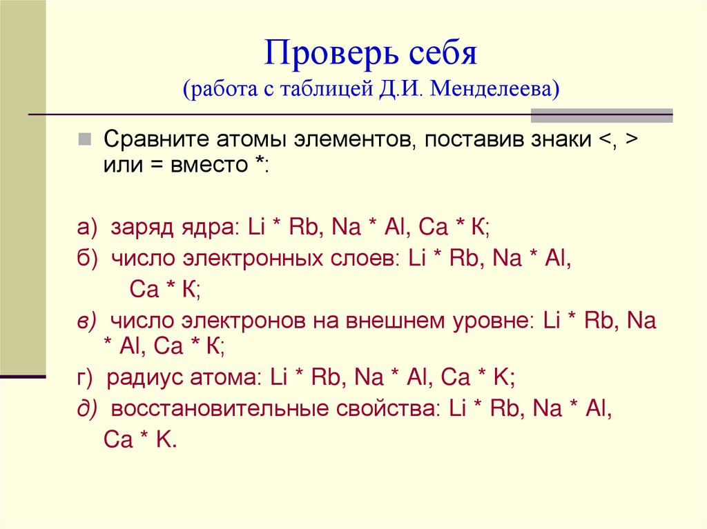 Сравните атомы элементов, поставив знаки <, >или = вместо *: