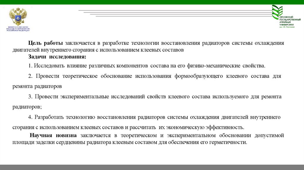 Цель работы заключается в разработке технологии восстановления радиаторов системы охлаждениядвигателей внутреннего сгорания с использованием клеевых составов