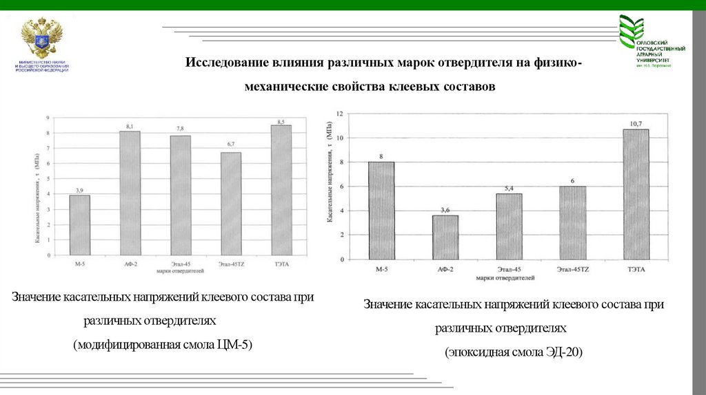 Исследование влияния различных марок отвердителя на физикомеханические свойства клеевых составовЗначение касательных напряжений клеевого состава при