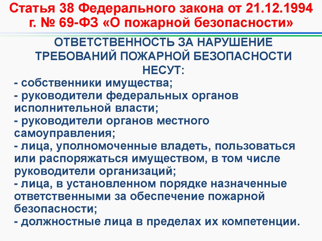 Статья 38 Федерального закона от 21.12.1994г. № 69-ФЗ «О пожарной безопасности»