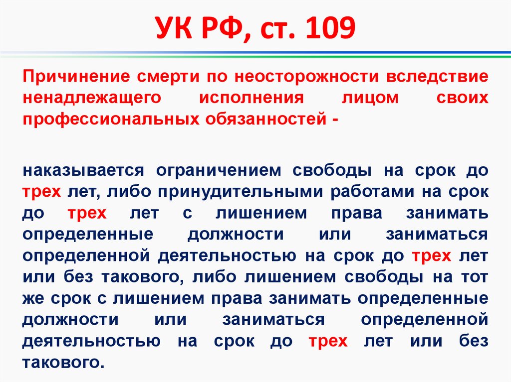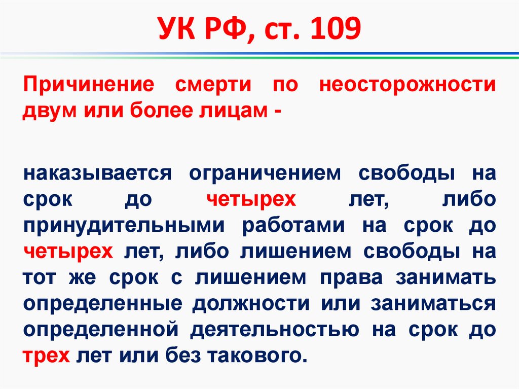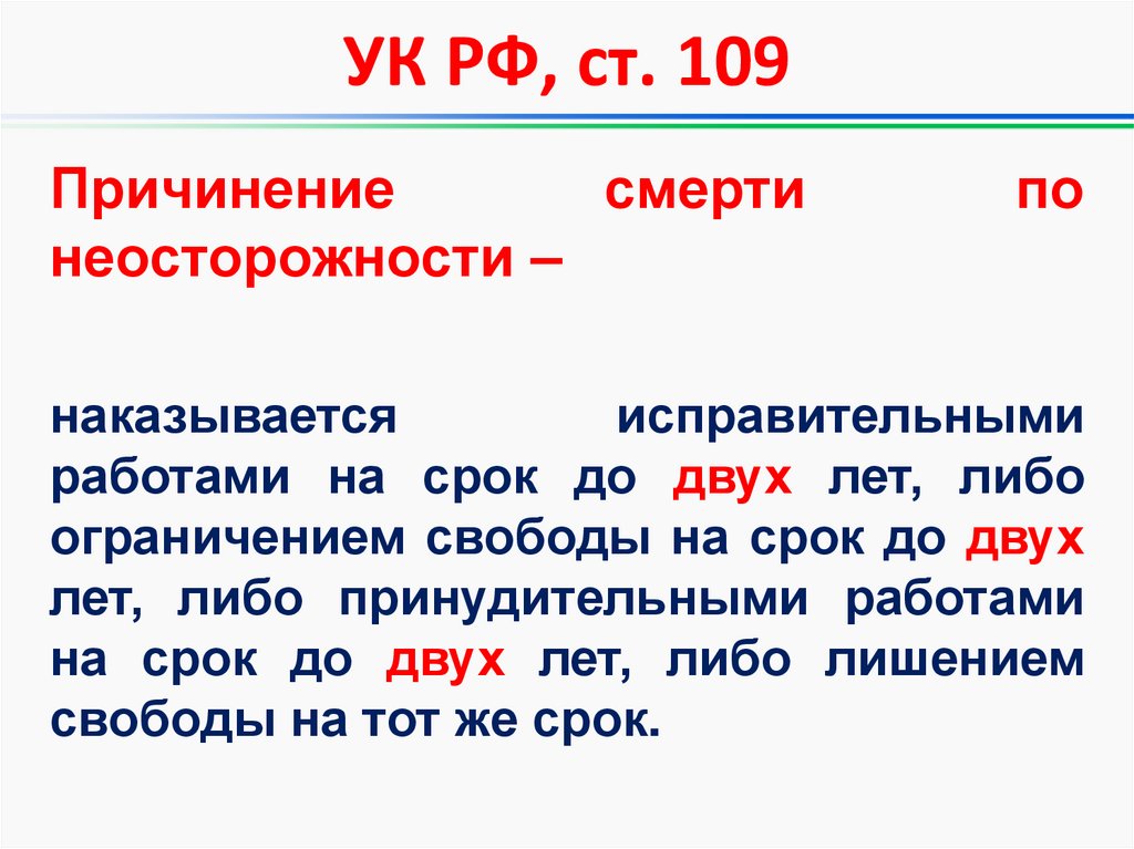 УК РФ, ст. 109Причинение смерти по неосторожности
