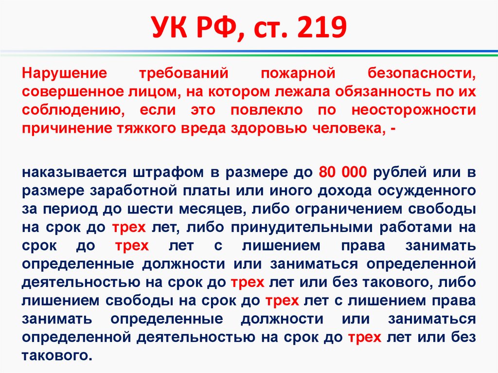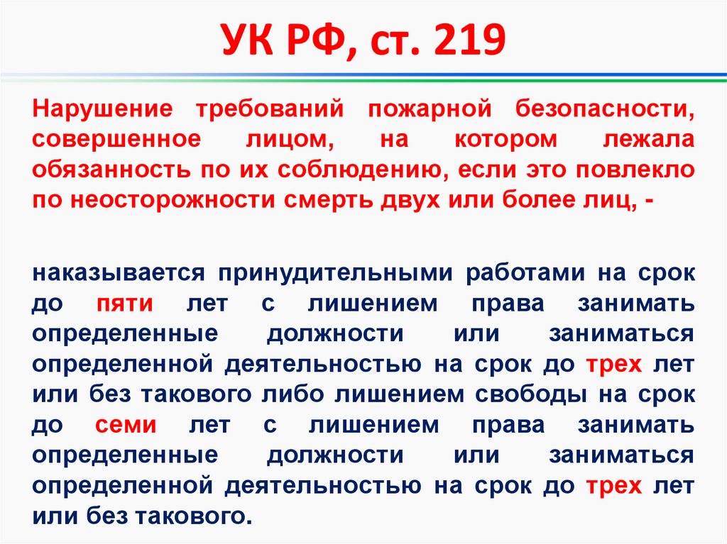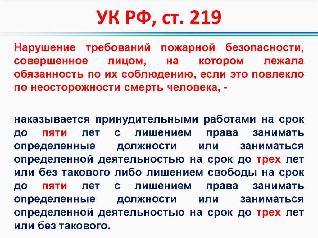 УК РФ, ст. 219Нарушение требований пожарной безопасности,