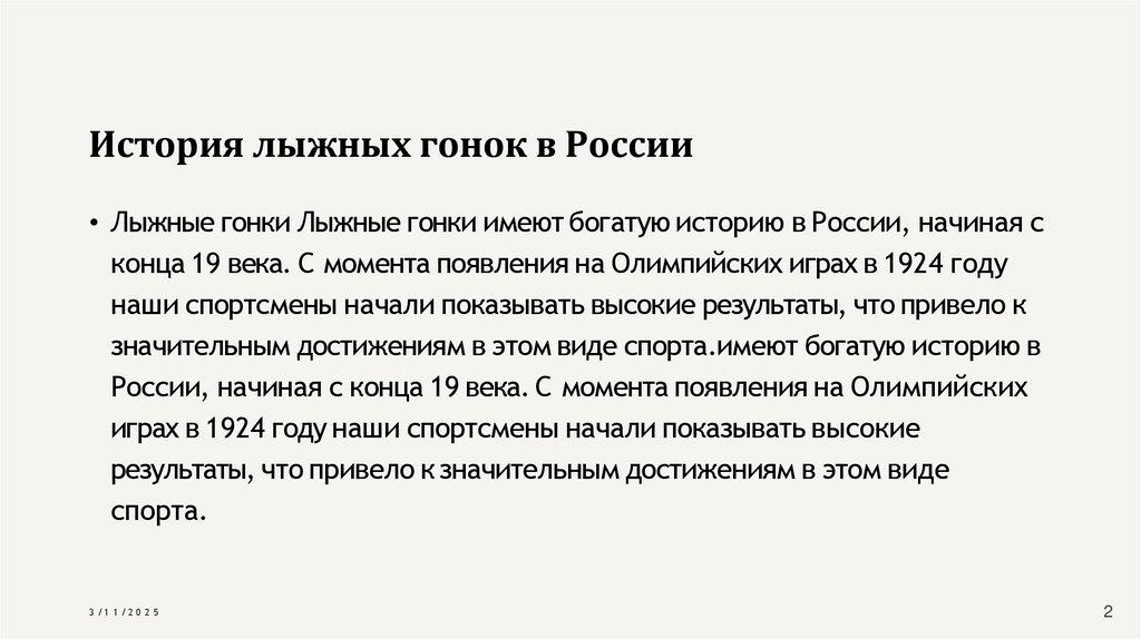 История лыжных гонок в России• Лыжные гонки Лыжные гонки имеют богатую историю в России, начиная с