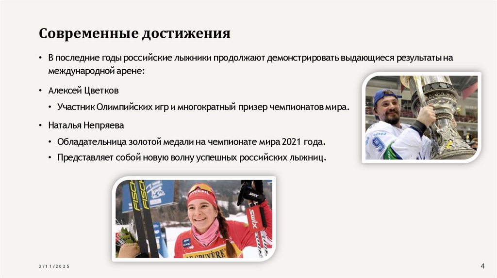 Современные достижения• В последние годы российские лыжники продолжают демонстрировать выдающиеся результаты на