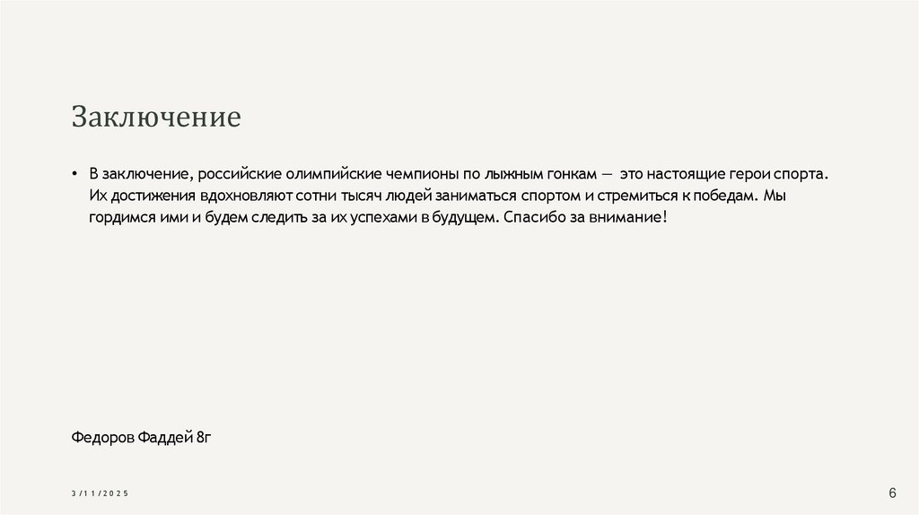 Заключение• В заключение, российские олимпийские чемпионы по лыжным гонкам — это настоящие герои спорта.