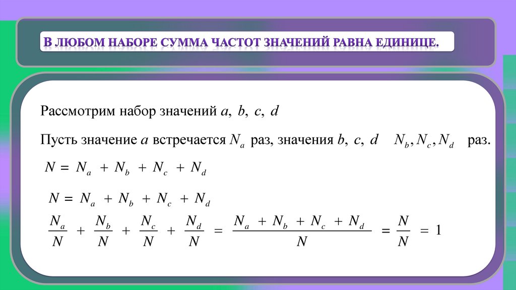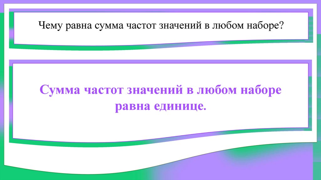 Чему равна сумма частот значений в любом наборе?Сумма частот значений в любом наборе