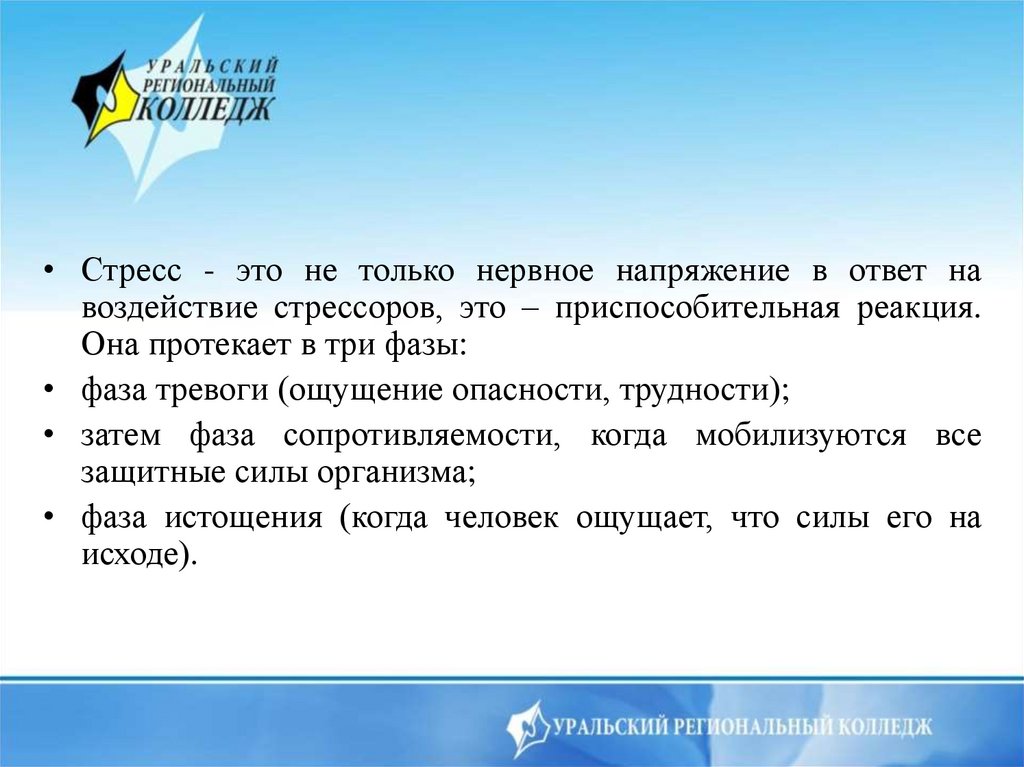 • Стресс - это не только нервное напряжение в ответ навоздействие стрессоров, это – приспособительная реакция.