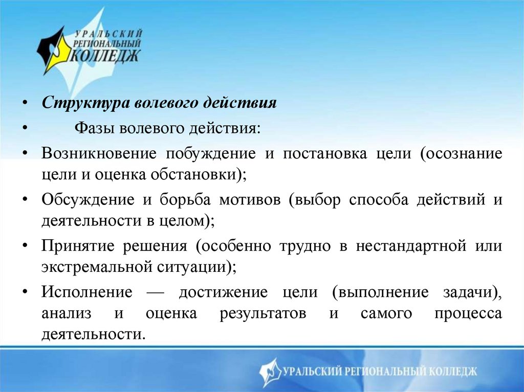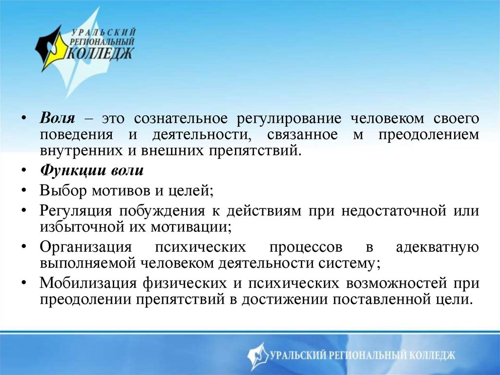 • Воля – это сознательное регулирование человеком своегоповедения и деятельности, связанное м преодолением