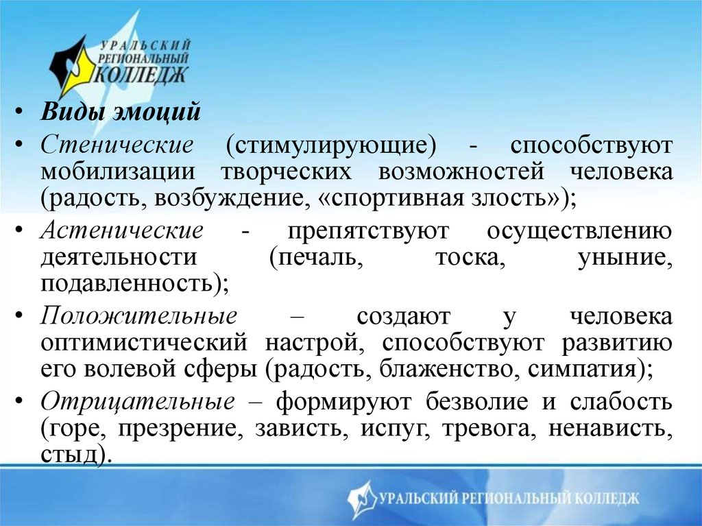 • Виды эмоций• Стенические (стимулирующие) - способствуют