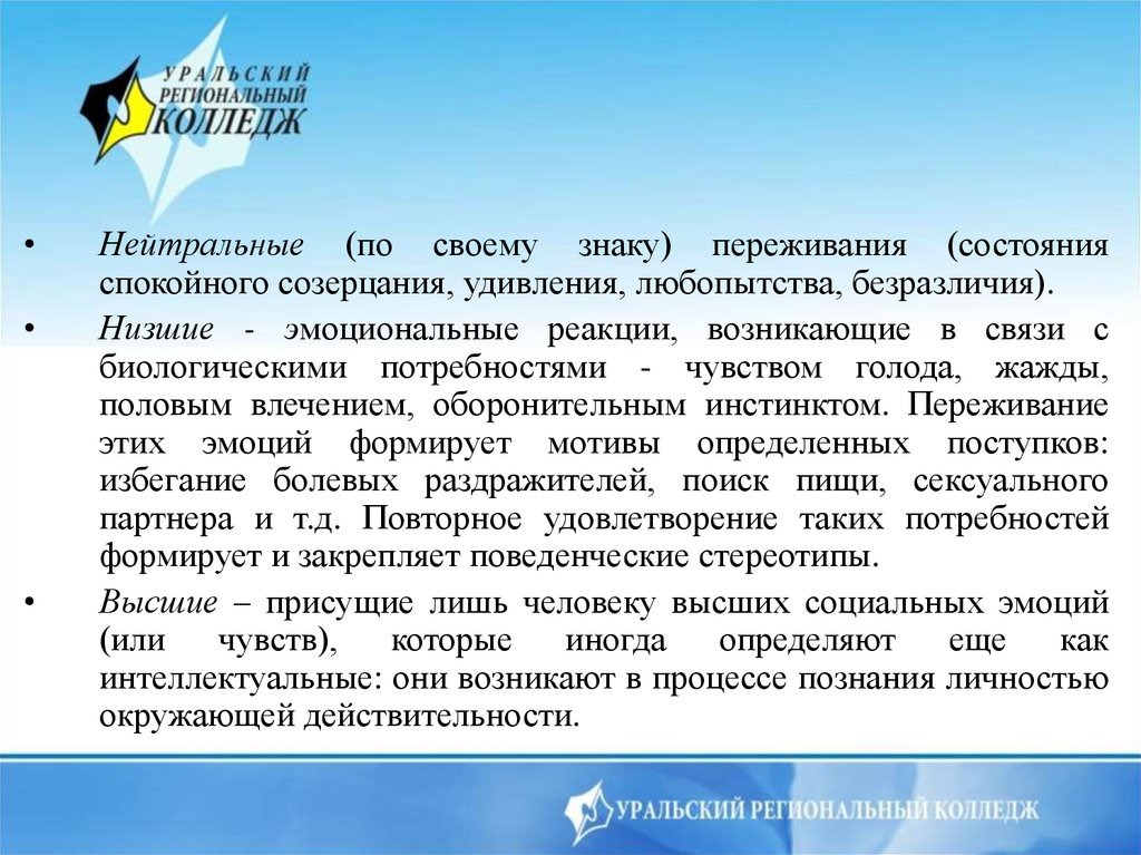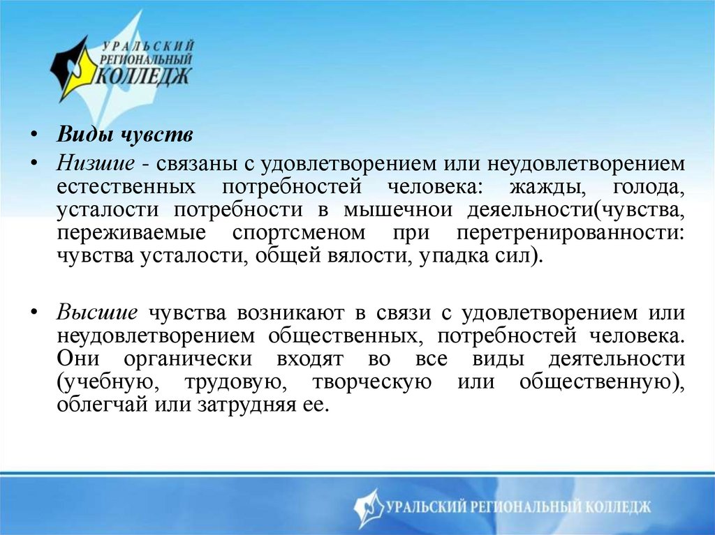 • Виды чувств• Низшие - связаны с удовлетворением или неудовлетворением