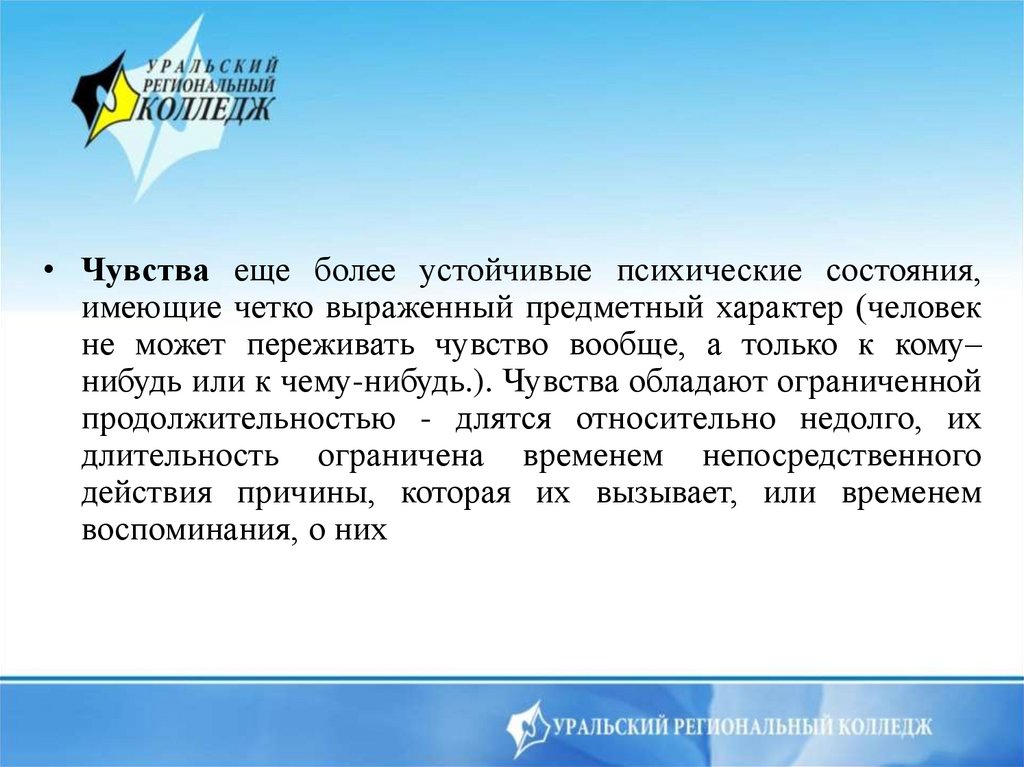 • Чувства еще более устойчивые психические состояния,имеющие четко выраженный предметный характер (человек