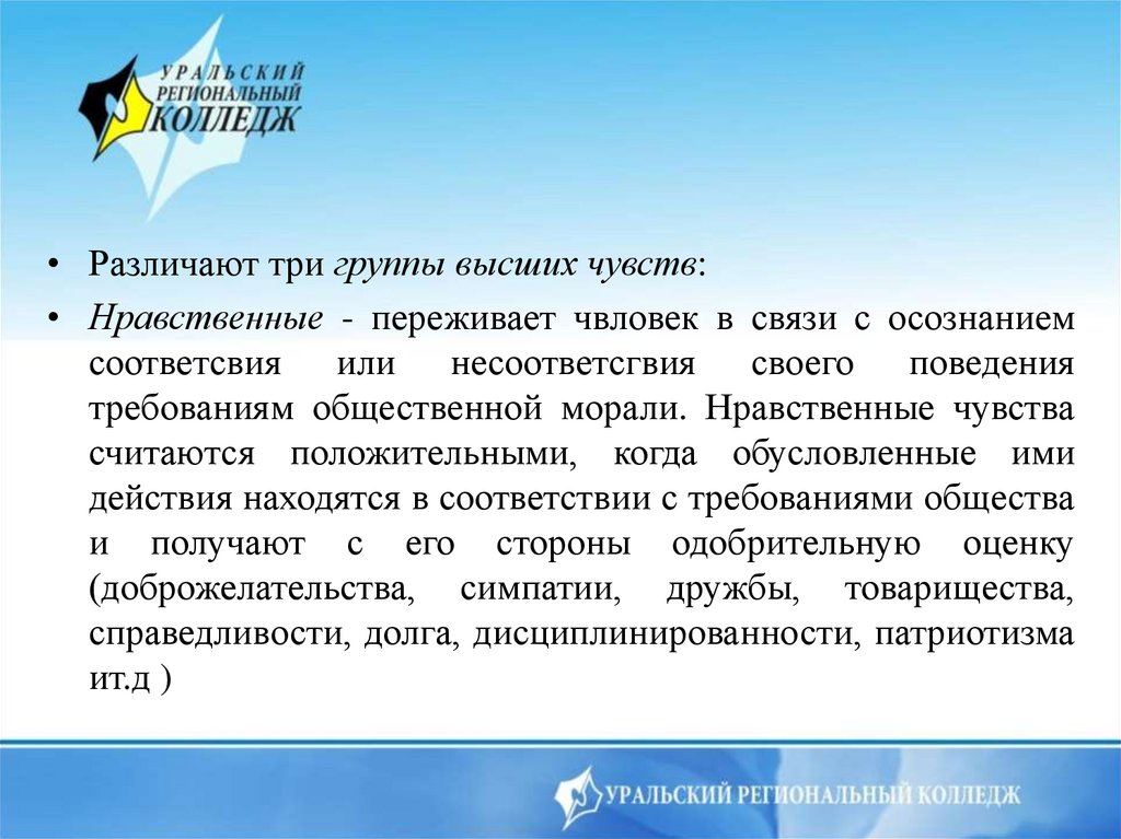 • Различают три группы высших чувств:• Нравственные - переживает чвловек в связи с осознанием