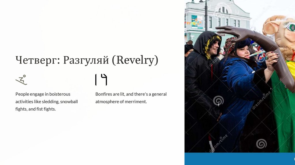 Четверг: Разгуляй (Revelry)People engage in boisterous