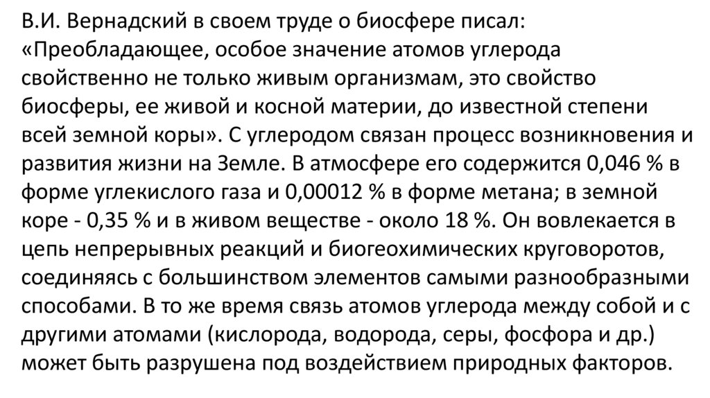 В.И. Вернадский в своем труде о биосфере писал:«Преобладающее, особое значение атомов углерода