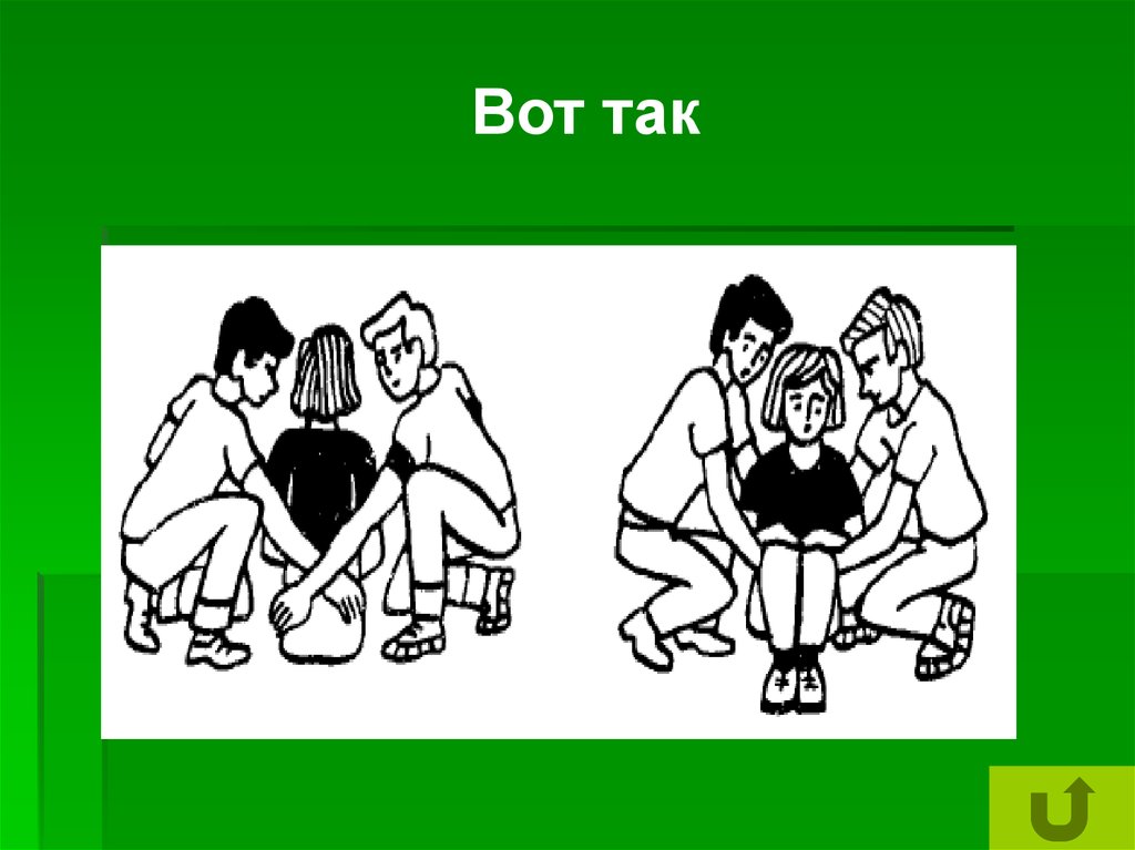 1. Сядьте на корточки лицом к друг другу по обе стороныпострадавшего. Пропустите по одной руке за его спиной