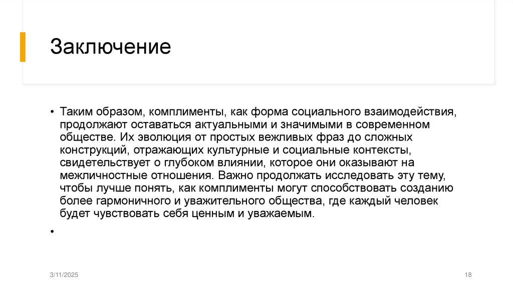 Заключение• Таким образом, комплименты, как форма социального взаимодействия,