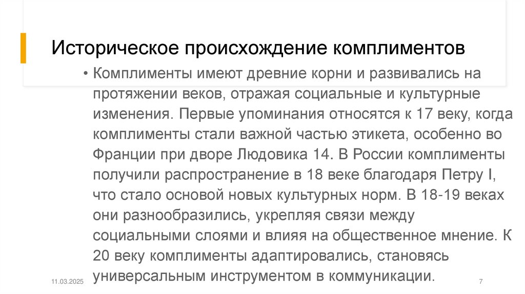 Историческое происхождение комплиментов• Комплименты имеют древние корни и развивались на