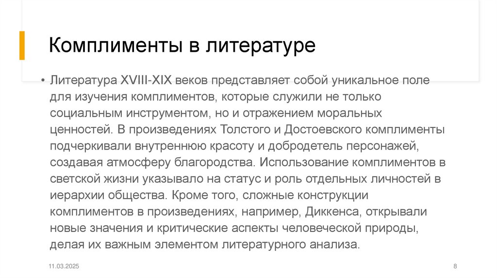 Комплименты в литературе• Литература XVIII-XIX веков представляет собой уникальное поле