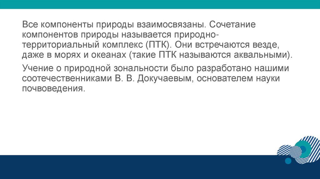 Все компоненты природы взаимосвязаны. Сочетаниекомпонентов природы называется природнотерриториальный комплекс (ПТК). Они встречаются везде,